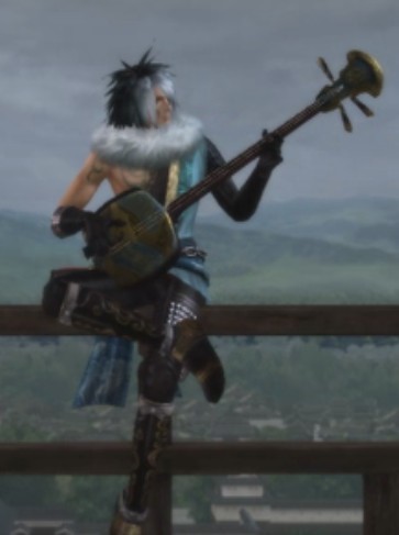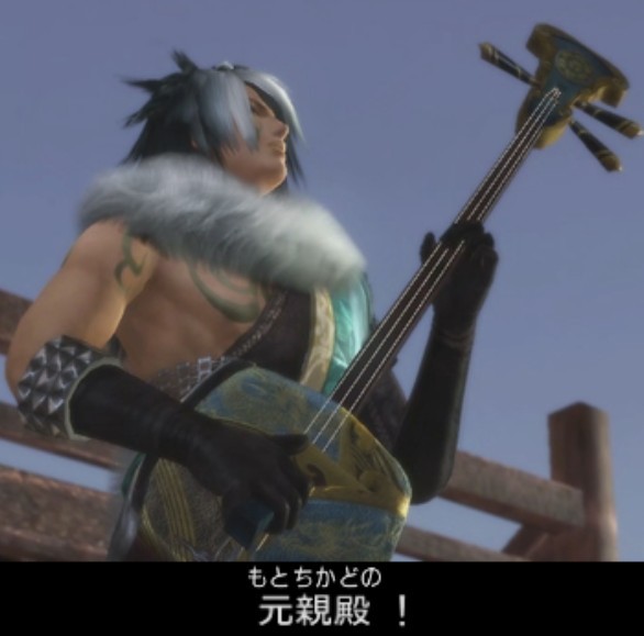元亲坐在栏杆上弹琴,一副潇洒派然