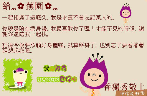 所谓一回生两回熟,看好友转生就明白了一二,这次的记录真是详细到令我汗颜,好吧,这次我也吧啦啦的长一丝拉,相较好友封小兔的信我真是觉得安慰,最喜欢你了喔,听看看,是你哦,不是别的什么哦,真感动,香仔你太含蓄了哦,你不会忘记谁要讲清楚哦,才能不见的时候,这让我想到香仔哪天你武功全失么,放心你的口才够混的,最后的最后我不得不讲,就算那啥那啥了也别忘了香菇想起我哦,真是,死了都要吃,不过放心吧,就算你退场了我也不会忘记你的呜呜,挥手绢,咳打断,咱俩就麦客气了天天都见面还这么的忘不忘的言之太早了鸟