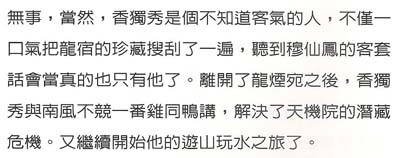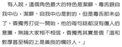 香獨秀是個奇葩,總是充滿不知道哪來的自信跟朝氣,總是神經粗大到得罪人也無自覺,總是在最緊要關頭跑去忙自己的事,總是會忘記人家最重要的交代。是個目中無人的个性,無人不是指他看不起別人,而是眼中根本沒有別人,別人對他的仇他不當一回事,別人受不了他,他渾然未覺,別人調侃他,他會說一切都是虛名,浮云而已,就算是婢女吐他槽他也不會生氣,有求于他只要合乎(他心目中的)公理正義他就會去作,作了之后也不認為是施恩,是個自我感覺不但良好而且非常良好的人